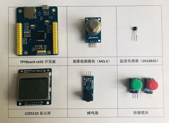 本次我们使用TPYBoard v102结合烟雾检测模块(MQ-2)、温度传感器、LCD5110液晶显示屏以及蜂鸣器模块等,模拟实现智能火灾报警器。